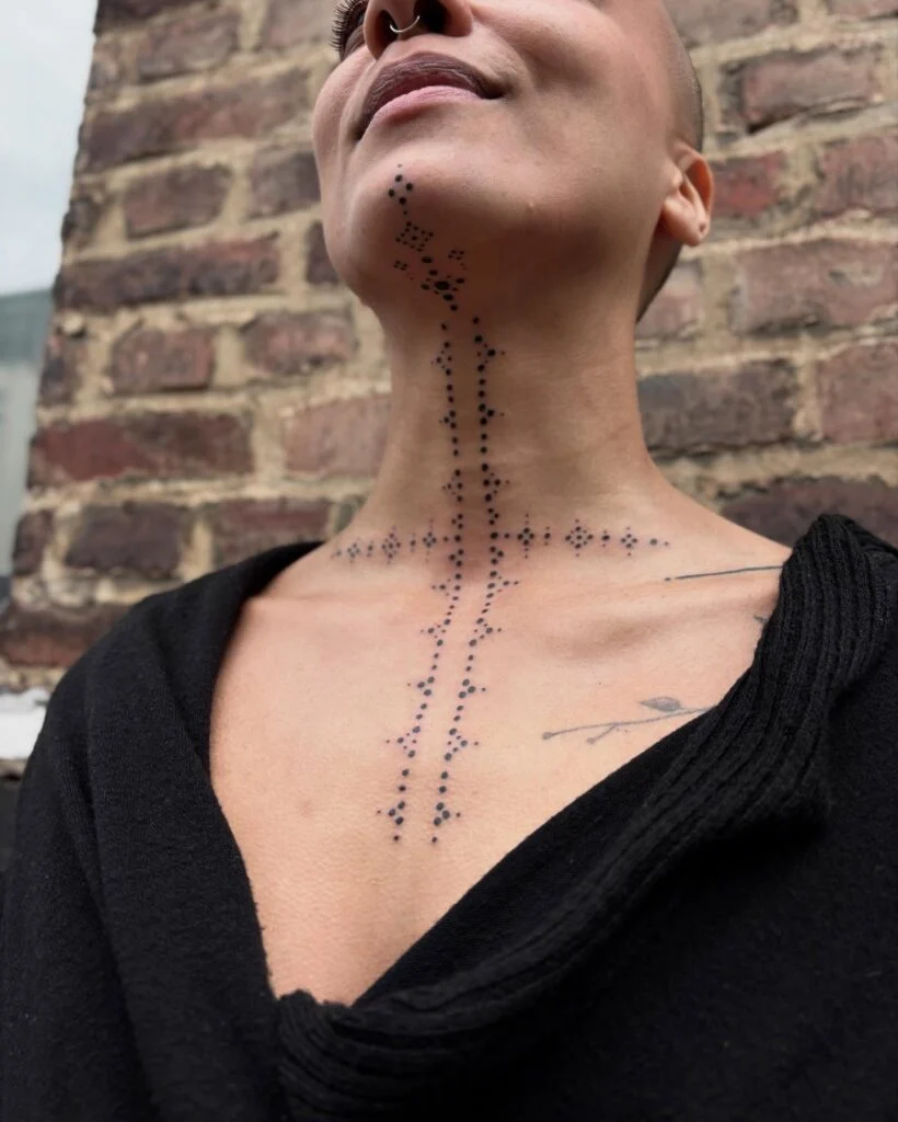 This striking stick and poke tattoo features a symmetrical cross-like pattern created entirely from fine dotwork. Extending from the chin down the neck and spreading across the collarbones, the design resembles tribal markings or ritualistic body art.