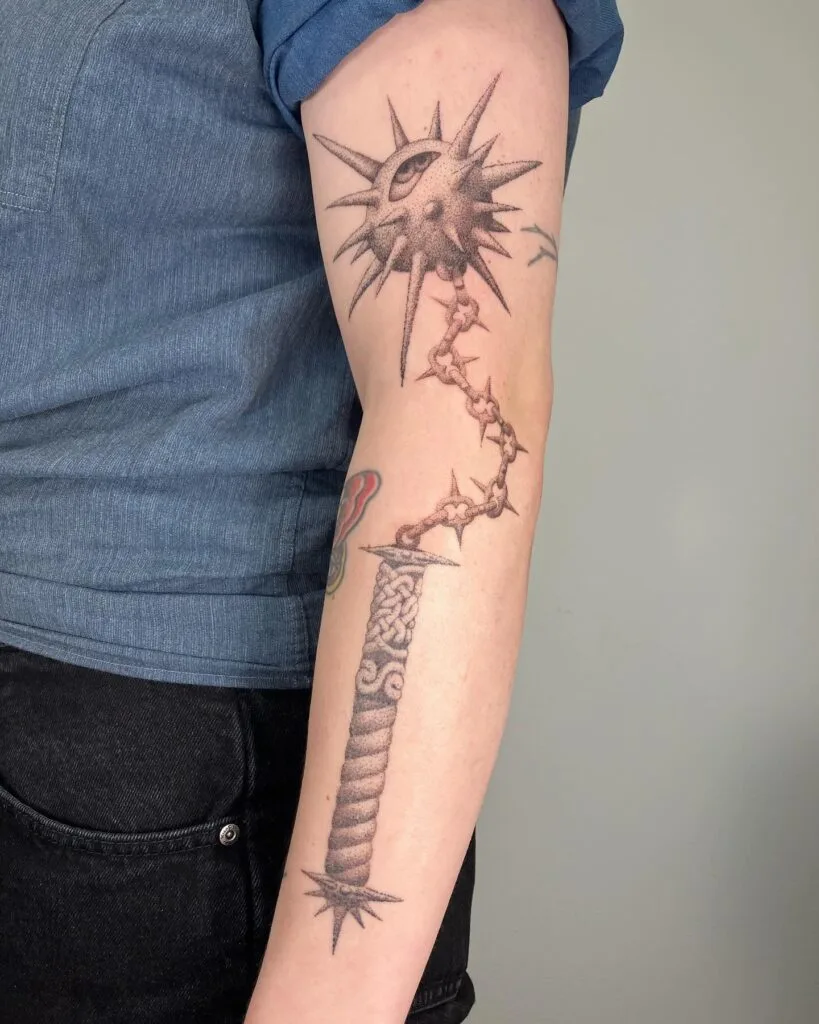 This bold and surreal stick and poke tattoo features a medieval flail weapon—its chain linking a spiked morning star with an all-seeing eye to a richly detailed handle. The eye embedded in the spiked head adds a mysterious, sentient twist to the brutal weapon imagery.