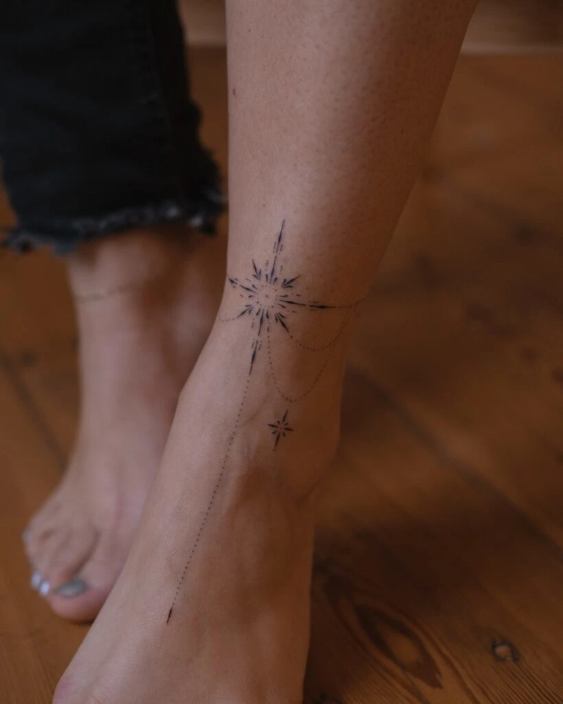 This elegant stick and poke tattoo wraps around the ankle with starburst shapes and fine dotted lines that resemble celestial chains or constellations. The design features a radiant central star near the ankle bone and a smaller star along the foot, all connected by soft, graceful arcs.