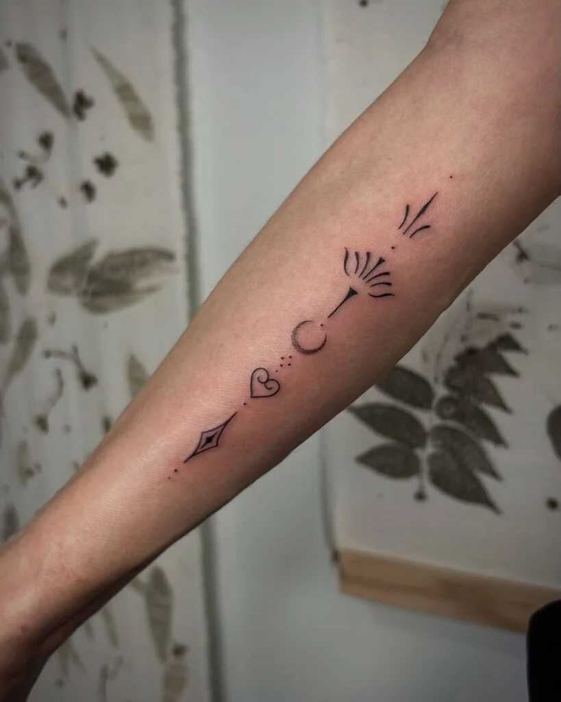 Placed on the inner arm, it uses symmetry and negative space to create a clean, balanced composition. The design feels light yet purposeful, symbolizing freedom, wishes, or letting go. It’s a beautiful example of how stick and poke techniques can craft abstract yet deeply meaningful art.