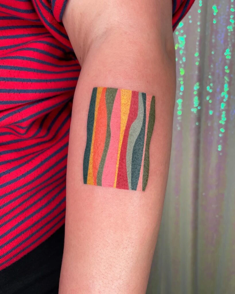 This bold and vibrant stick and poke tattoo features a rectangular block filled with undulating stripes in rich, earthy rainbow tones—like forest green, mustard yellow, coral, and deep red. The flowing lines create a sense of movement and harmony, while the color palette adds warmth and personality.