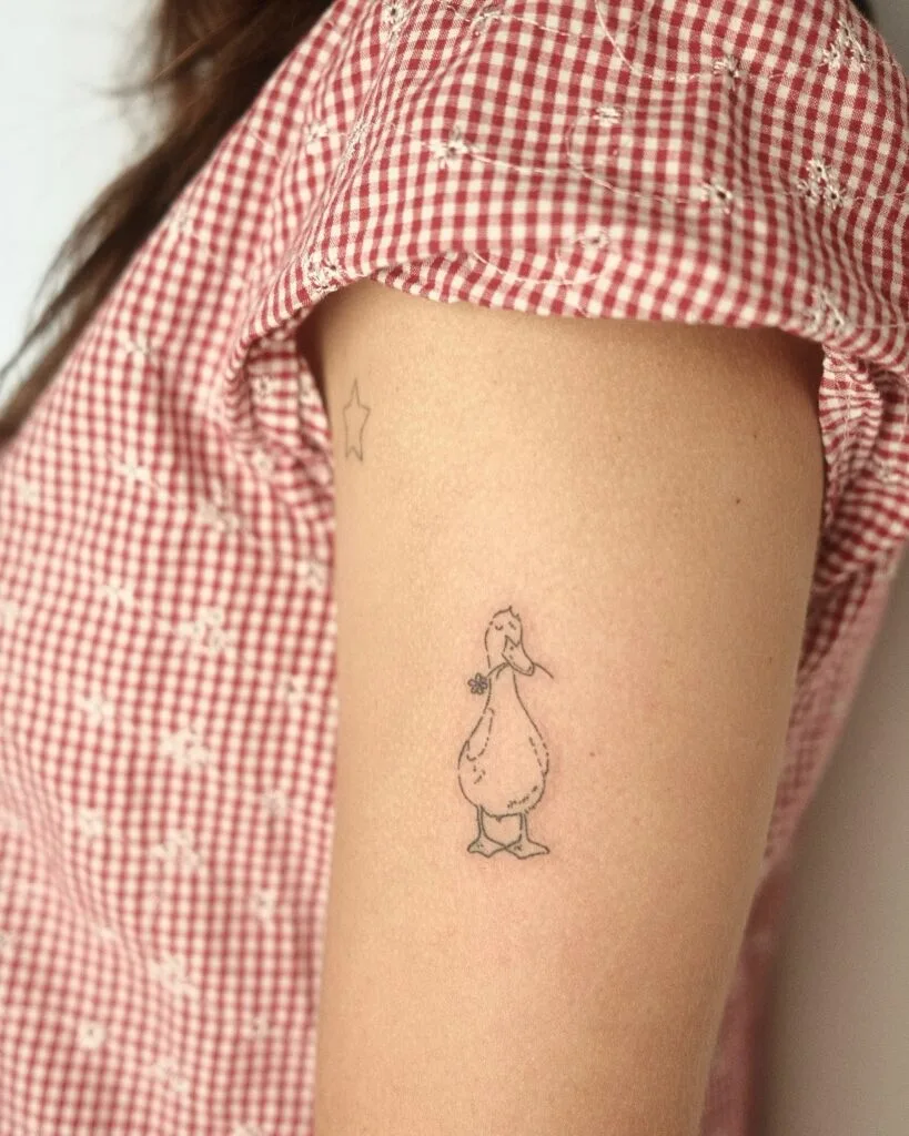 This endearing stick and poke tattoo shows a cartoon-style duck holding a small flower in its beak, drawn in a soft, sketchy outline. The expression on the duck’s face is gentle and content, adding a heartfelt charm to the minimalist design.