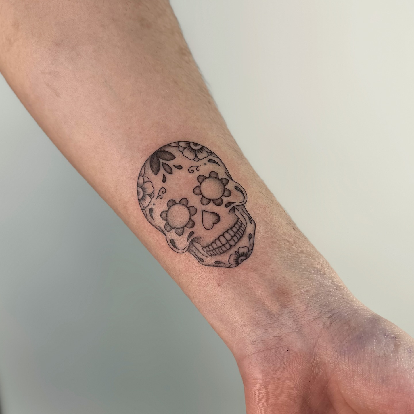 Placed on the wrist, the tattoo blends fine line work with classic Day of the Dead inspiration.