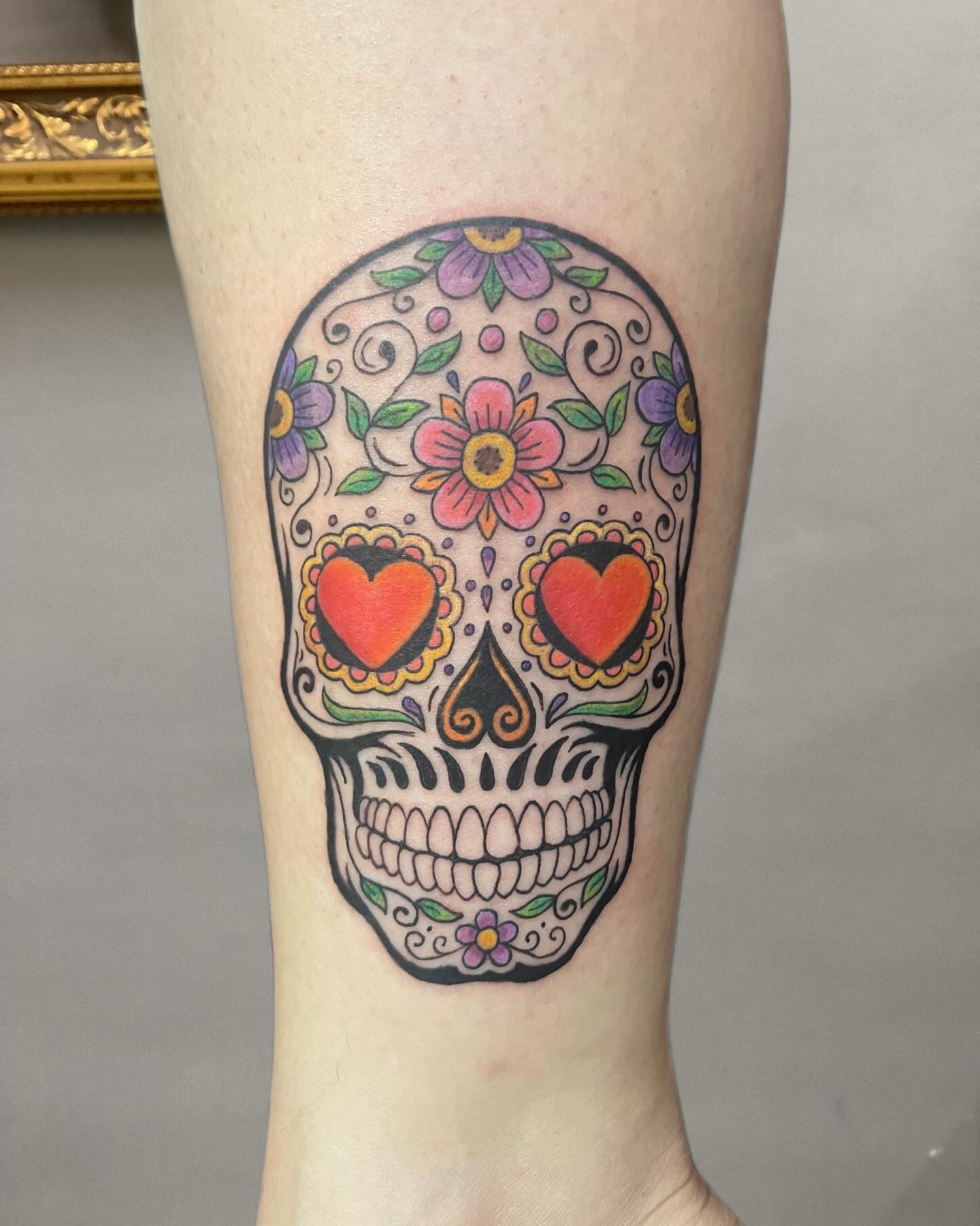 The tattoo combines bold colorwork with classic sugar skull ornamentation.