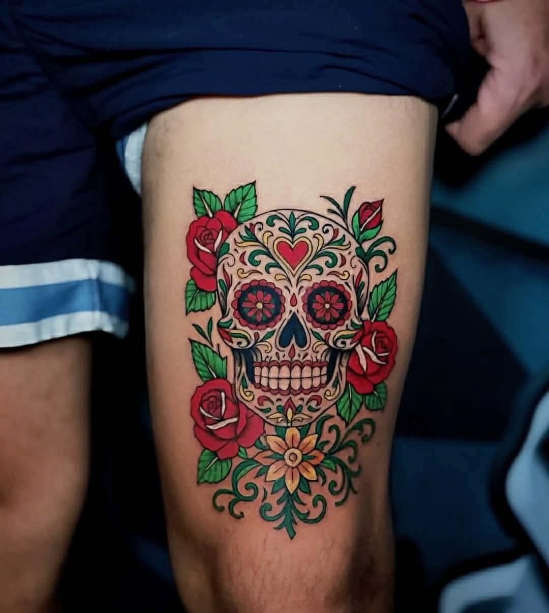 Placed on the thigh, the tattoo combines bold color, floral beauty, and classic Day of the Dead styling.