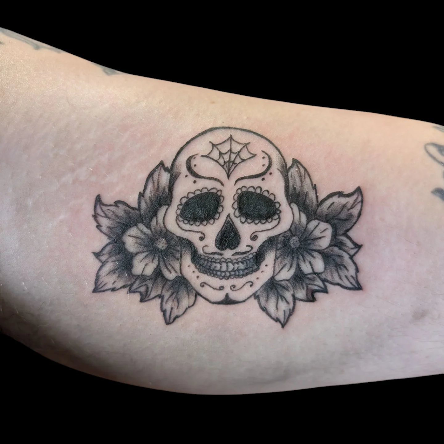 The flowers on each side balance the skull and soften the structure. Placed on the arm, the tattoo blends floral beauty with classic Day of the Dead styling.