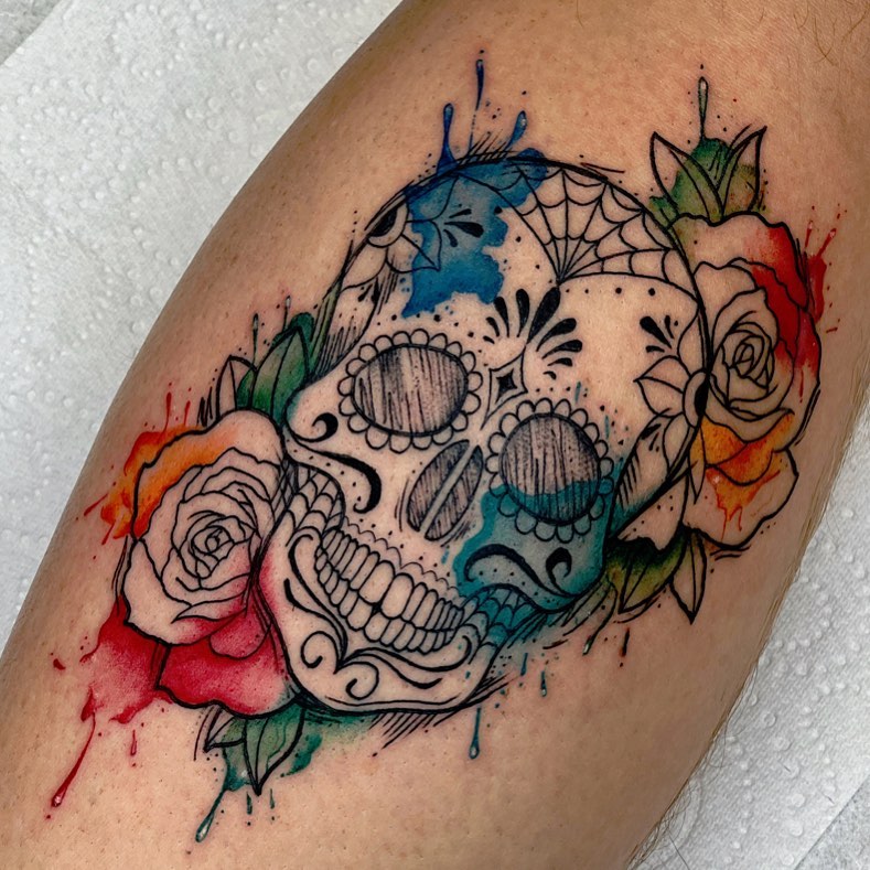 This sugar skull tattoo blends traditional Day of the Dead details with vibrant watercolor splashes.