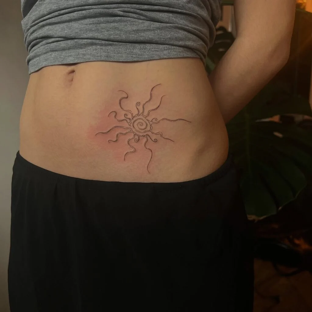 The use of fine black lines keeps it minimal yet visually striking. Positioned just above the waistline, it’s a bold and expressive choice that blends abstract artistry with solar symbolism, perfect for those who want a distinctive and personal tattoo.