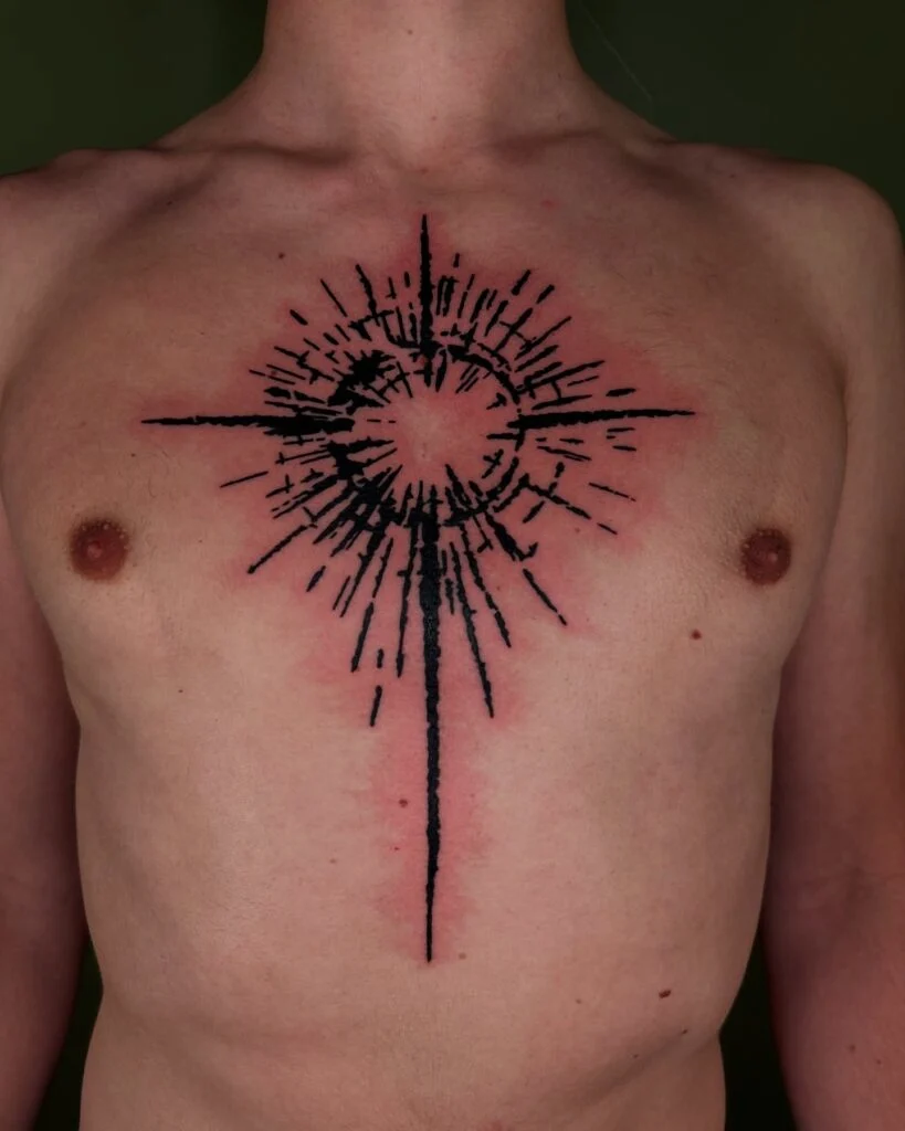 This bold chest tattoo features an abstract sunburst design made up of thick, jagged black lines radiating outward from a rough circular center. The dynamic, uneven rays give it an intense and raw energy, as if the sun is exploding with force and light.