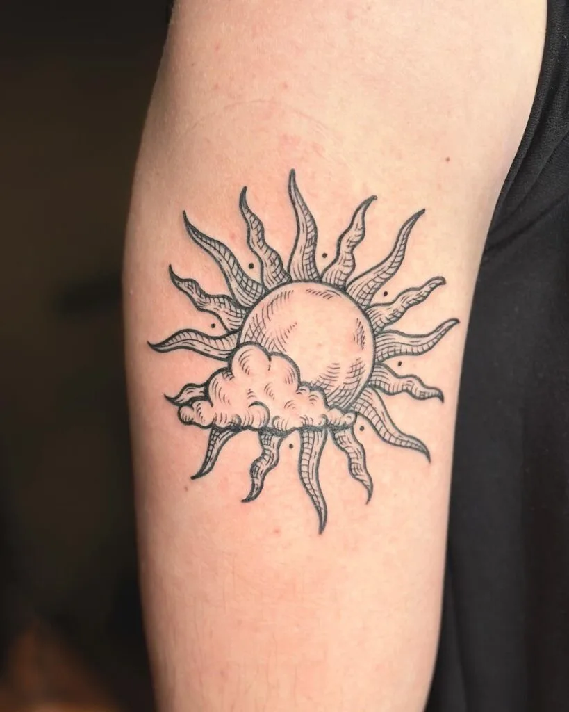 This striking blackwork tattoo showcases a radiant sun partially veiled by a stylized cloud. Bold linework and subtle shading create a vintage engraving effect, adding depth and character to the piece.
