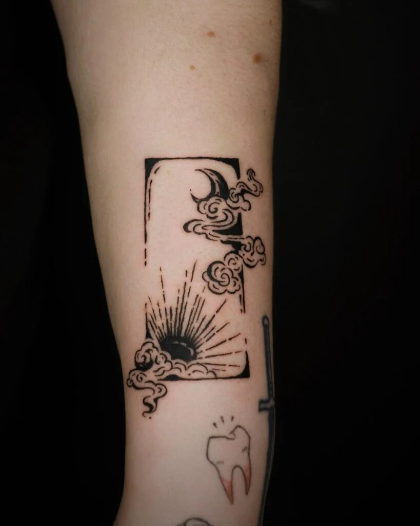 This creative tattoo captures a stylized scene of a rising sun and a crescent moon within a rectangular frame. Bold black ink outlines the sun emerging from behind swirling clouds, with sharp sunrays stretching upward.
