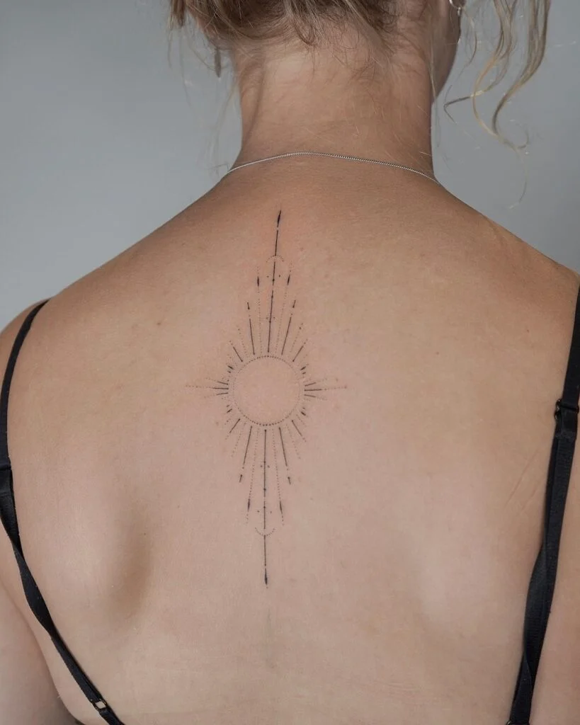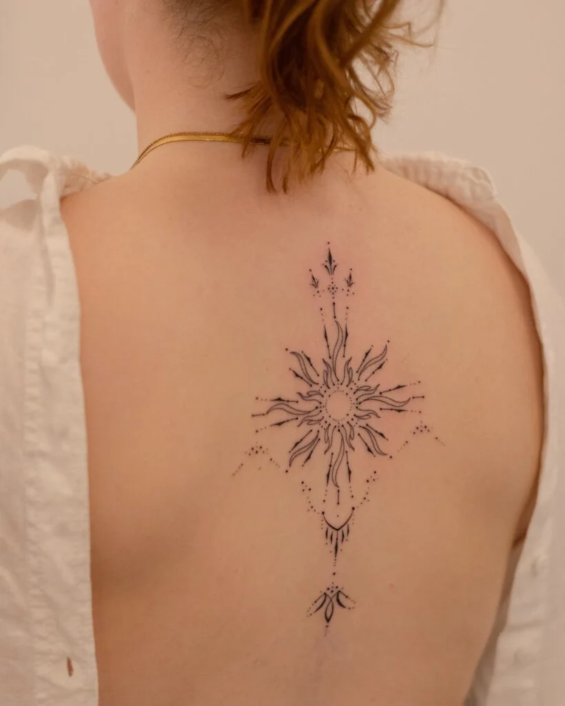 This tattoo showcases an intricate sunburst design centered along the spine, featuring fine ornamental detailing and flowing lines. The radiating sun rays are stylized with gentle curves and pointed extensions, while delicate dotwork and symmetrical flourishes add elegance to the overall composition.