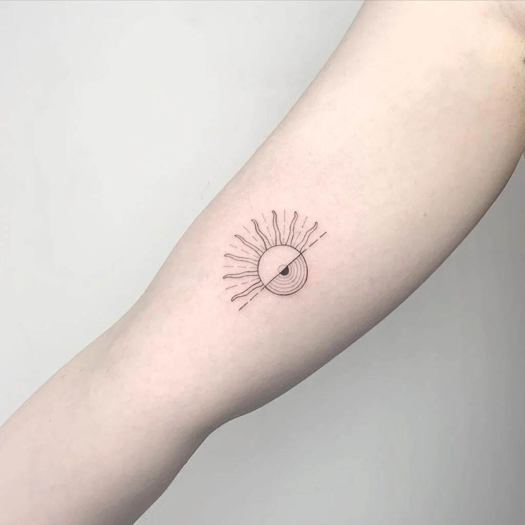 This minimalist tattoo on the inner arm presents a creative half-sun design. One side features fine curved rays extending outward, while the other displays clean concentric circles that resemble a vinyl record or topographic rings.
