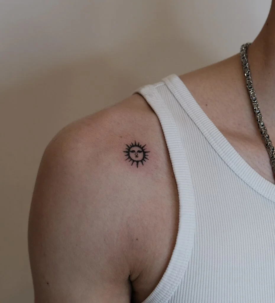 This tiny sun tattoo, placed just above the shoulder, features a delicate face with serene, closed eyes. The subtle rays radiating outward are evenly spaced and finely inked, giving it a clean, minimal aesthetic.