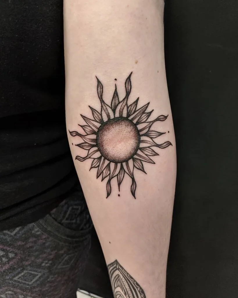 This tattoo showcases a symmetrical sun design with pointed and flame-like rays, centered around a smooth circular core created using fine dotwork shading.