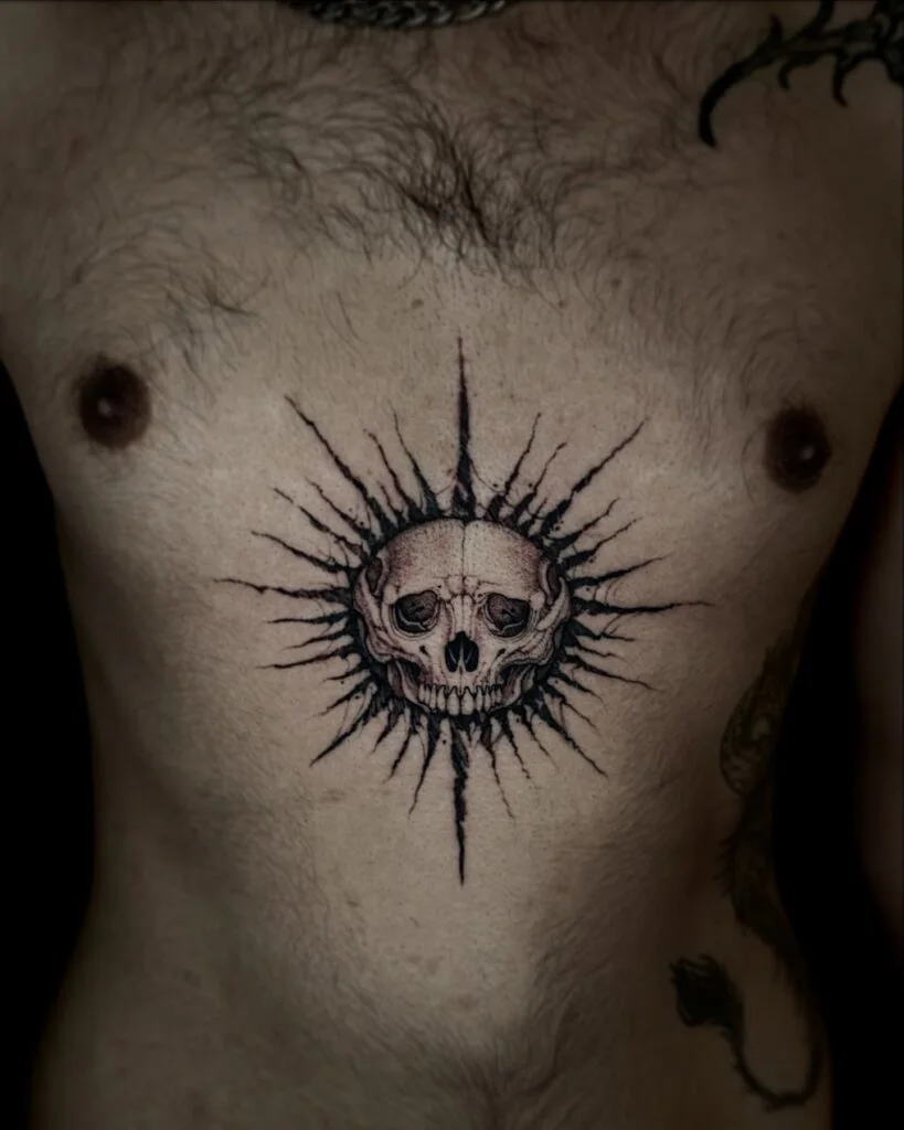 This bold chest tattoo features a striking skull at its center, encircled by jagged, radiating sunrays. The intense black ink contrasts with the soft shading of the skull, giving it a hauntingly realistic look.