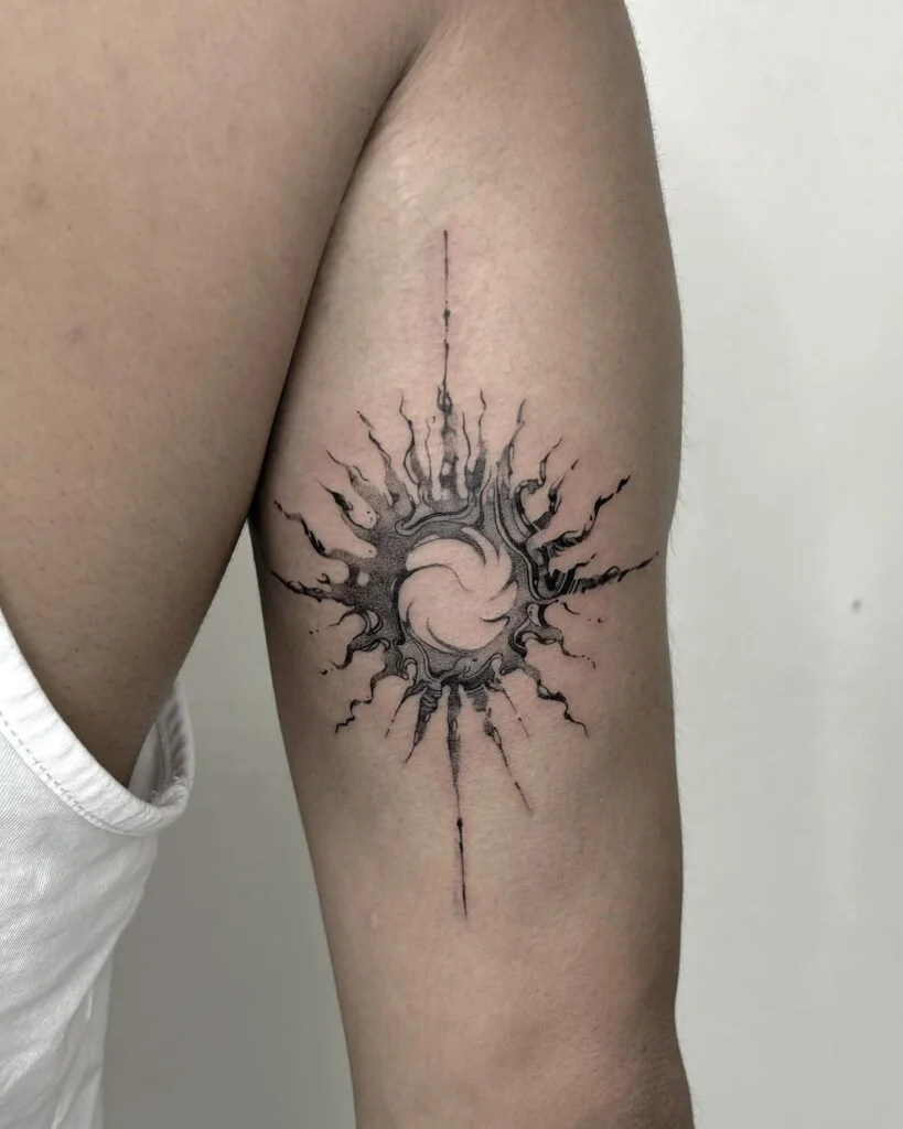 Positioned on the upper arm, it brings together the idea of intense inner energy and outer radiance. The unusual fill in the sun’s core gives the design a modern, edgy twist—perfect for someone who wants a sun tattoo that feels powerful, unique, and slightly unpredictable.
