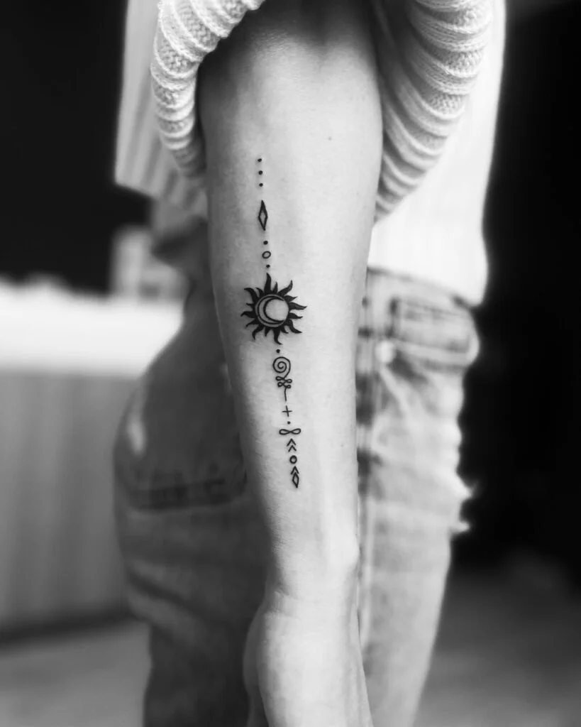 This sleek and minimalistic tattoo features a black sun with a crescent moon at its center, symbolizing balance between opposites. Positioned on the inner forearm, it’s surrounded by a vertical line of delicate geometric and spiritual symbols.