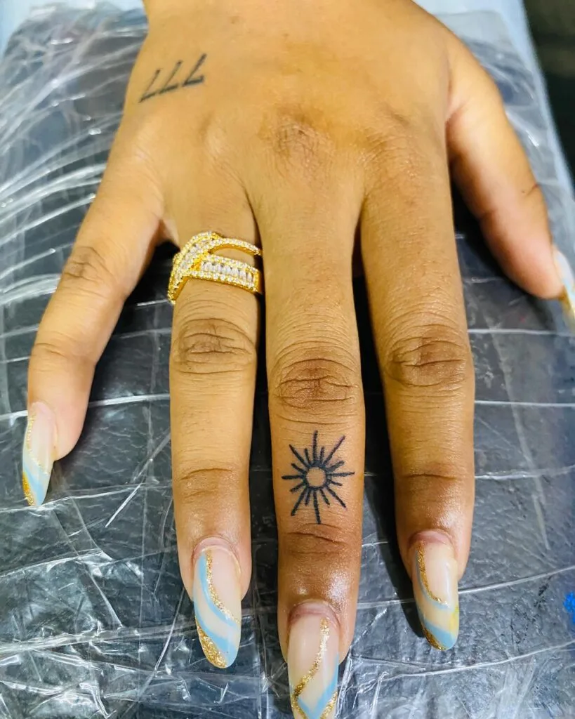 Finger tattoos like this are perfect for minimalists who want something visible but not overpowering. The sun can represent light, energy, and renewal—making it a fitting choice for someone who values warmth and positivity. This design pairs effortlessly with rings and stylish nails, giving it an effortlessly chic vibe.