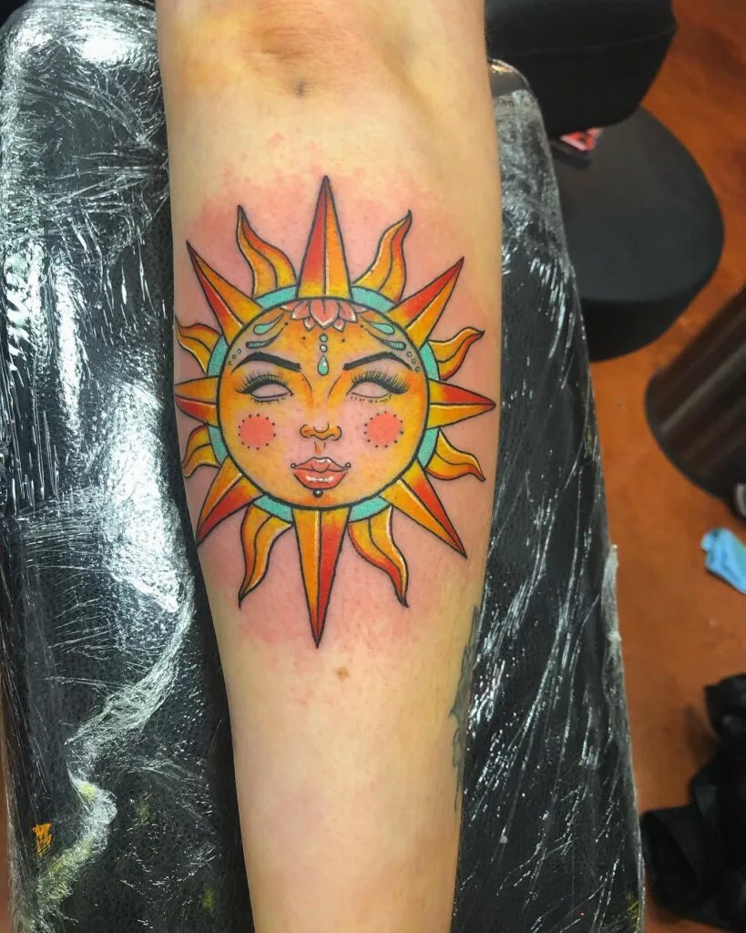 This bold and colorful tattoo features a radiant sun with a serene, feminine face, symbolizing strength and vitality. The rich orange and yellow sun rays are accented with cool turquoise details, creating a striking contrast that adds depth to the design.