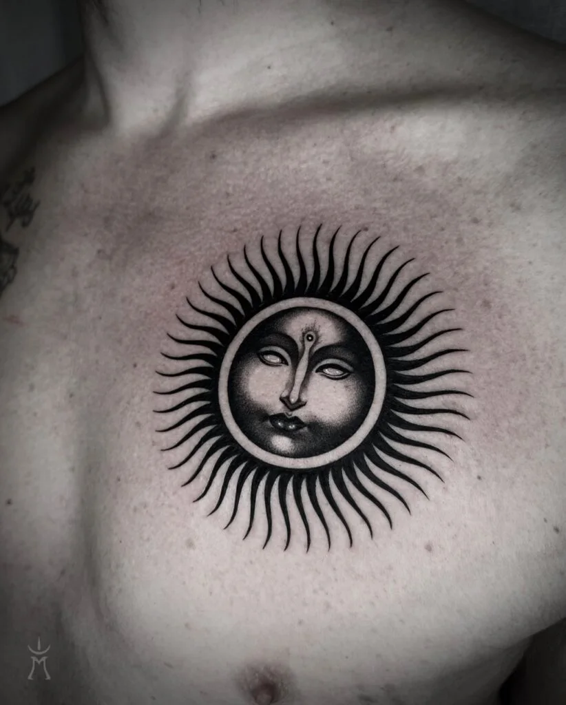 Centered delicately on the chest, this tattoo blends the radiant sun with intricate geometric precision. The circular core is surrounded by finely detailed rays that alternate between bold and dotted textures, forming a symmetrical mandala-like pattern.