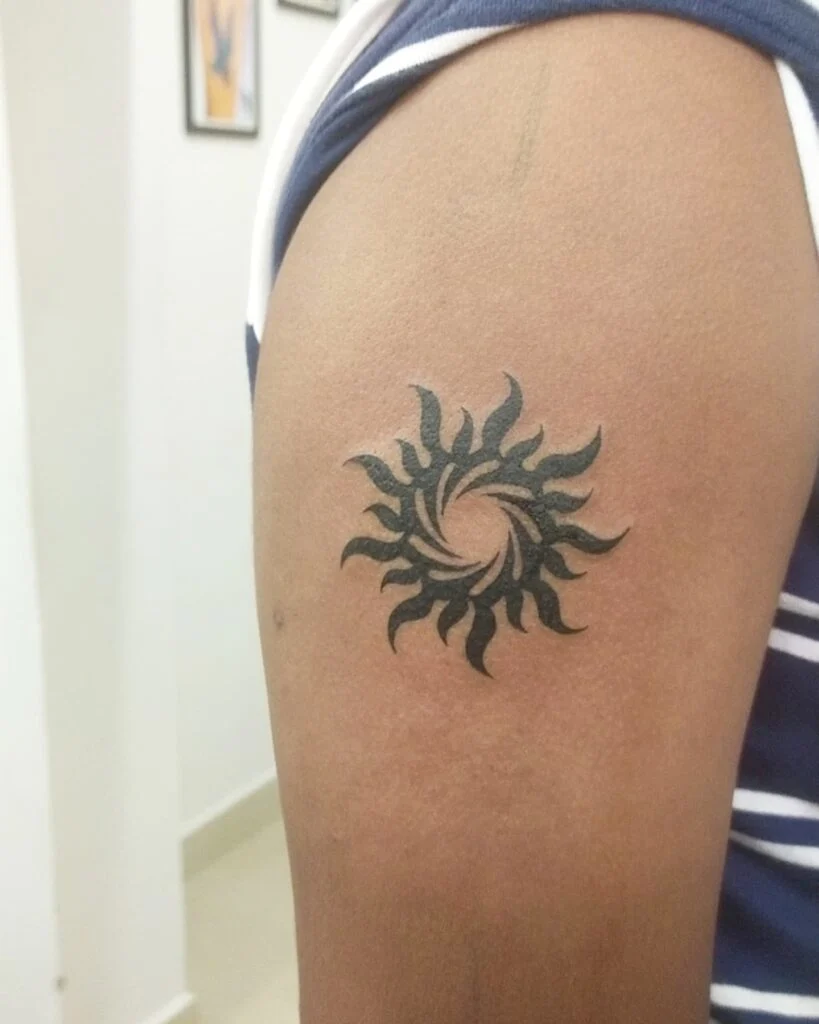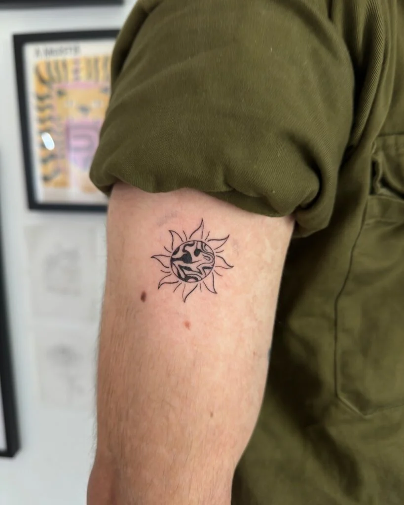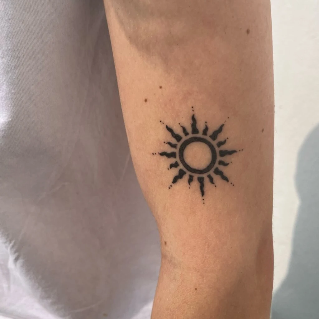 Positioned on the upper arm, it brings together the idea of intense inner energy and outer radiance. The unusual fill in the sun’s core gives the design a modern, edgy twist—perfect for someone who wants a sun tattoo that feels powerful, unique, and slightly unpredictable.