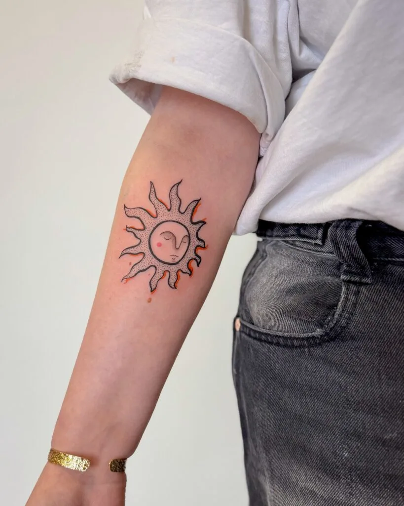 Pops of orange accent the tips of the rays, adding warmth and personality to the design. The blush on the cheeks and gentle expression enhance the overall charm, creating a sun that feels friendly and full of character. Positioned on the forearm, it’s perfect for someone who wants a cute, sunny symbol of light and positivity.