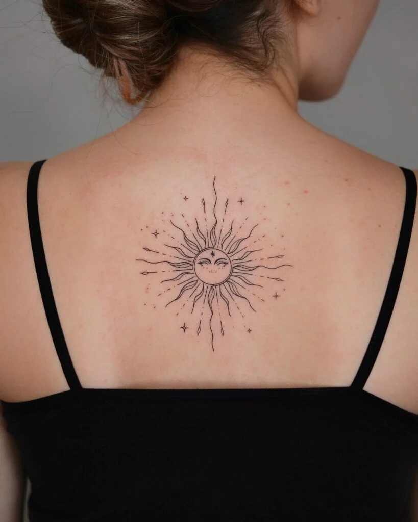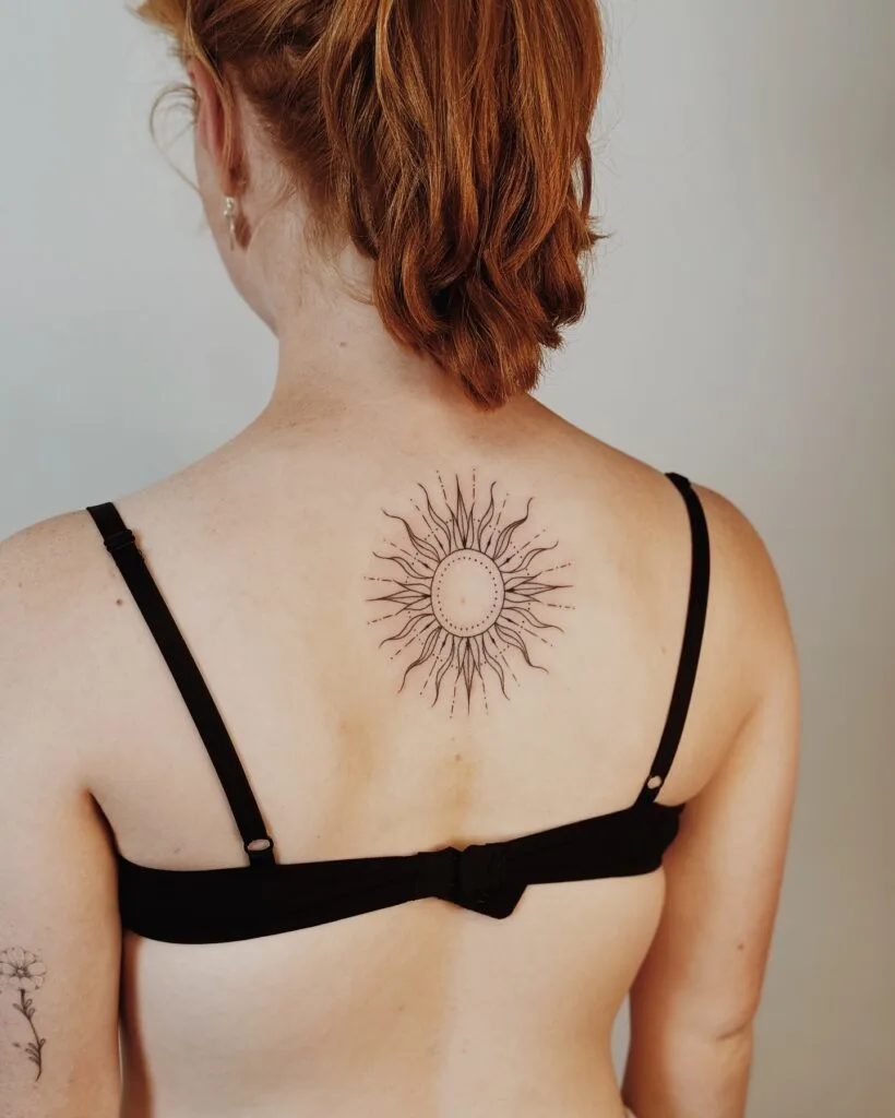 This elegant upper back tattoo features a softly detailed sun design with fine, flowing rays and a central circle adorned with symmetrical dotwork. The rays alternate between long and short lines, some slightly curved, creating a graceful sense of movement.