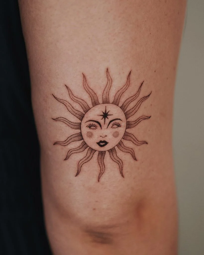 The expression on the sun’s face brings a peaceful, almost dreamy vibe to the design, making it feel warm and approachable. It’s a fun and artistic choice for someone who wants a sun tattoo with a bit of personality and charm, blending celestial elegance with sweet, whimsical detail.