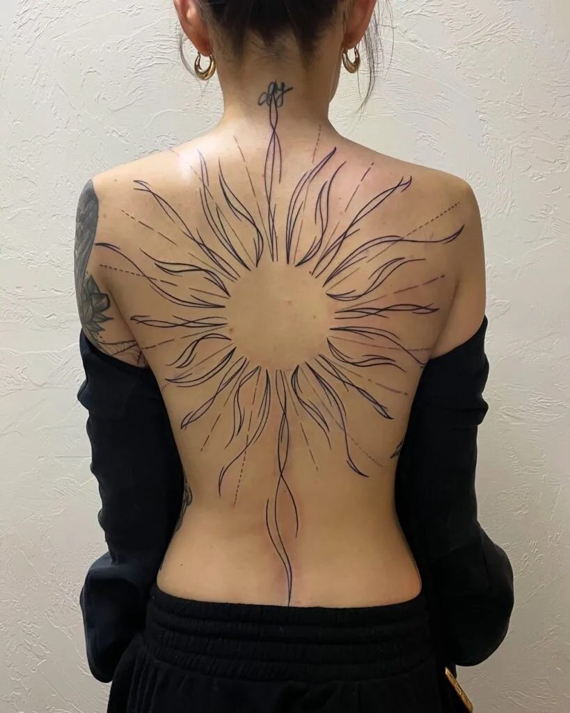 The use of fine black lines keeps it minimal yet visually striking. Positioned just above the waistline, it’s a bold and expressive choice that blends abstract artistry with solar symbolism, perfect for those who want a distinctive and personal tattoo.
