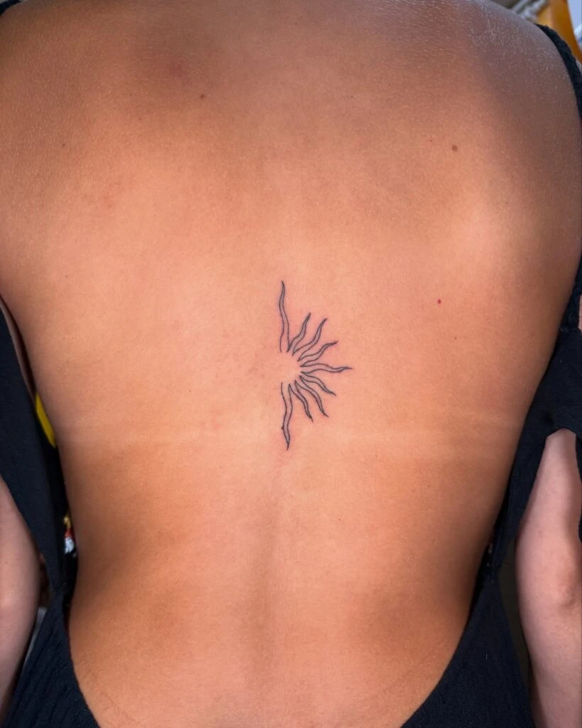 This tattoo showcases an intricate sunburst design centered along the spine, featuring fine ornamental detailing and flowing lines. The radiating sun rays are stylized with gentle curves and pointed extensions, while delicate dotwork and symmetrical flourishes add elegance to the overall composition.