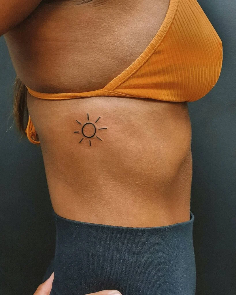 This dainty sun tattoo sits neatly on the side ribcage, offering a discreet yet radiant accent. Its fine lines and compact size make it ideal for those who appreciate minimalist body art with symbolic depth.