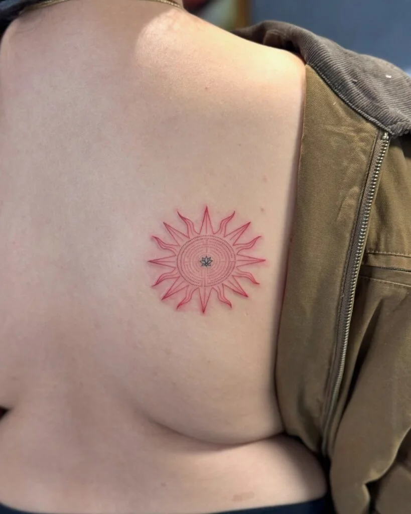 Tiny dotted accents between the rays add a touch of texture and uniqueness. The choice of red ink gives it a softer, more artistic tone compared to traditional black, making it a perfect statement piece that feels both energetic and personal.
