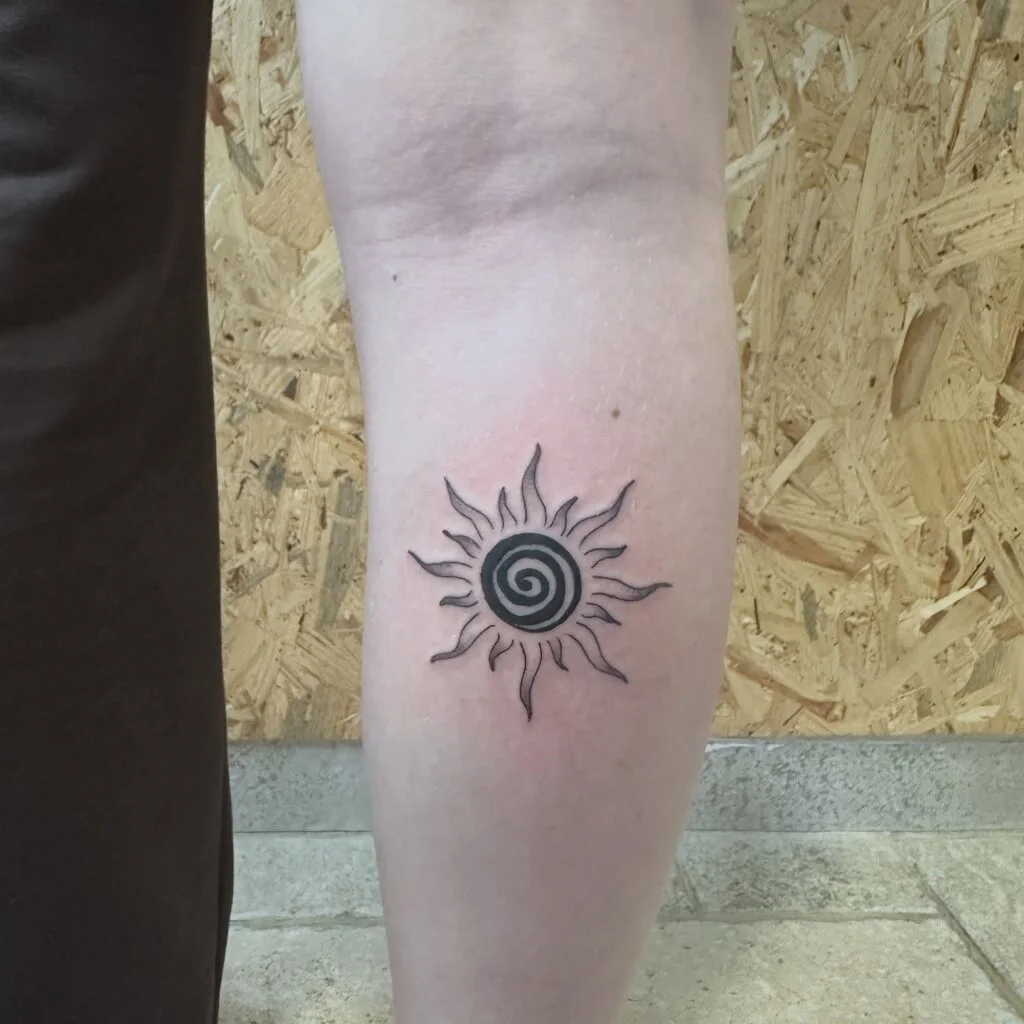 This tattoo features a radiant sun with thin, flame-like rays extending outward from a bold spiral center. The swirling core draws attention instantly, creating a sense of motion and energy.