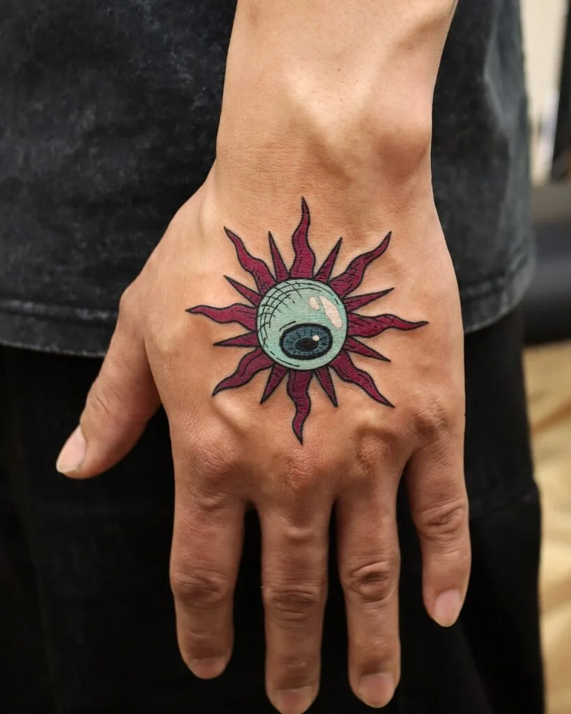 This bold and surreal hand tattoo combines a vibrant eyeball with fiery sun rays in a design that’s both striking and otherworldly.