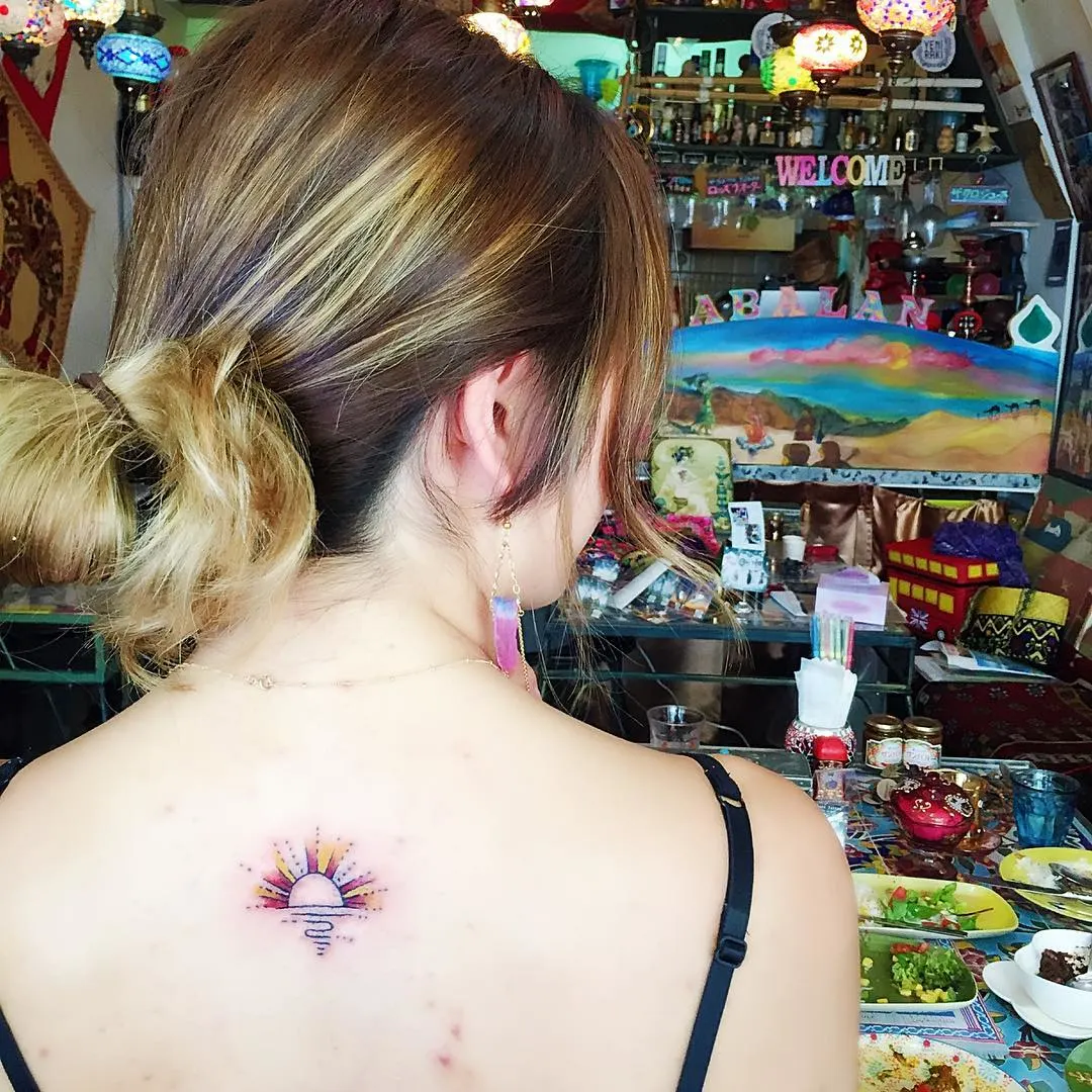 This small but striking sunrise tattoo glows beautifully against the upper back, creating a warm and uplifting focal point.