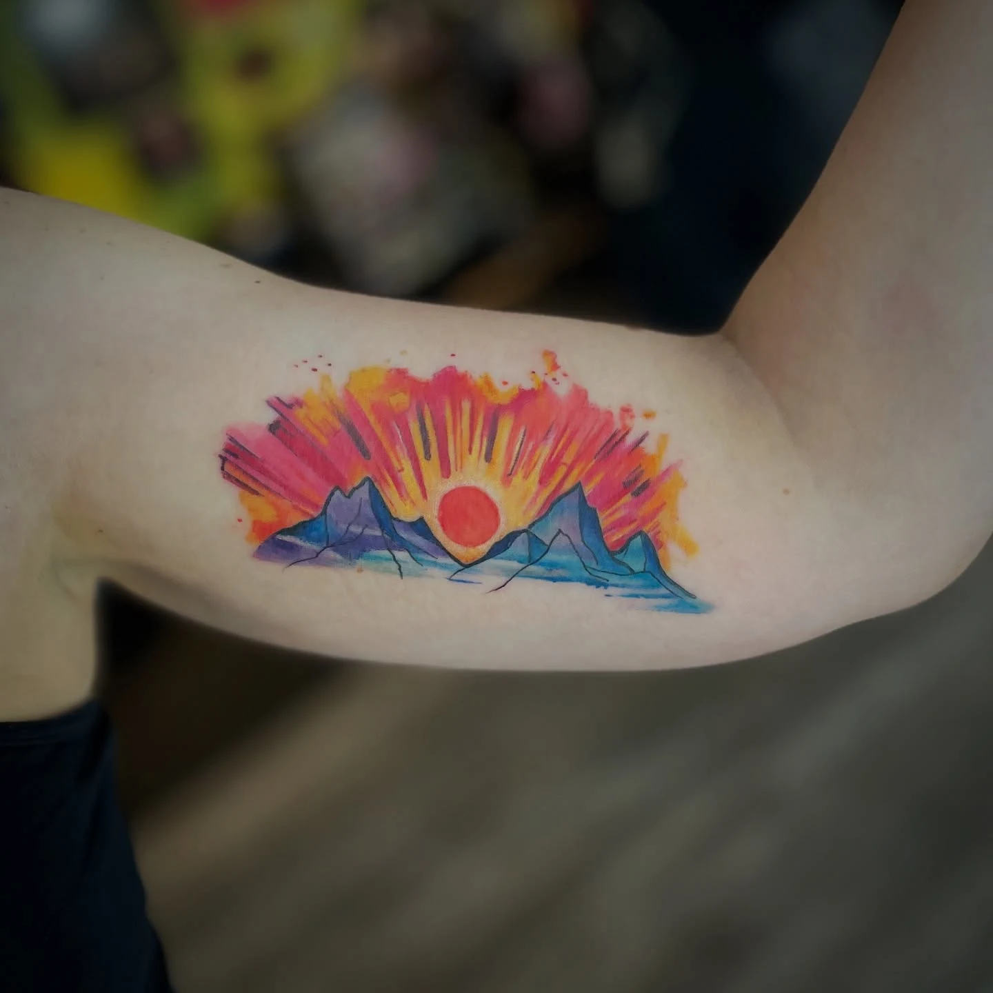 This vibrant sunrise tattoo bursts with color and energy, creating a stunning scene of light over mountains.