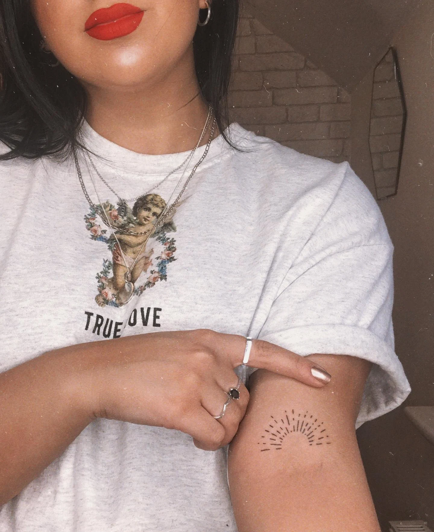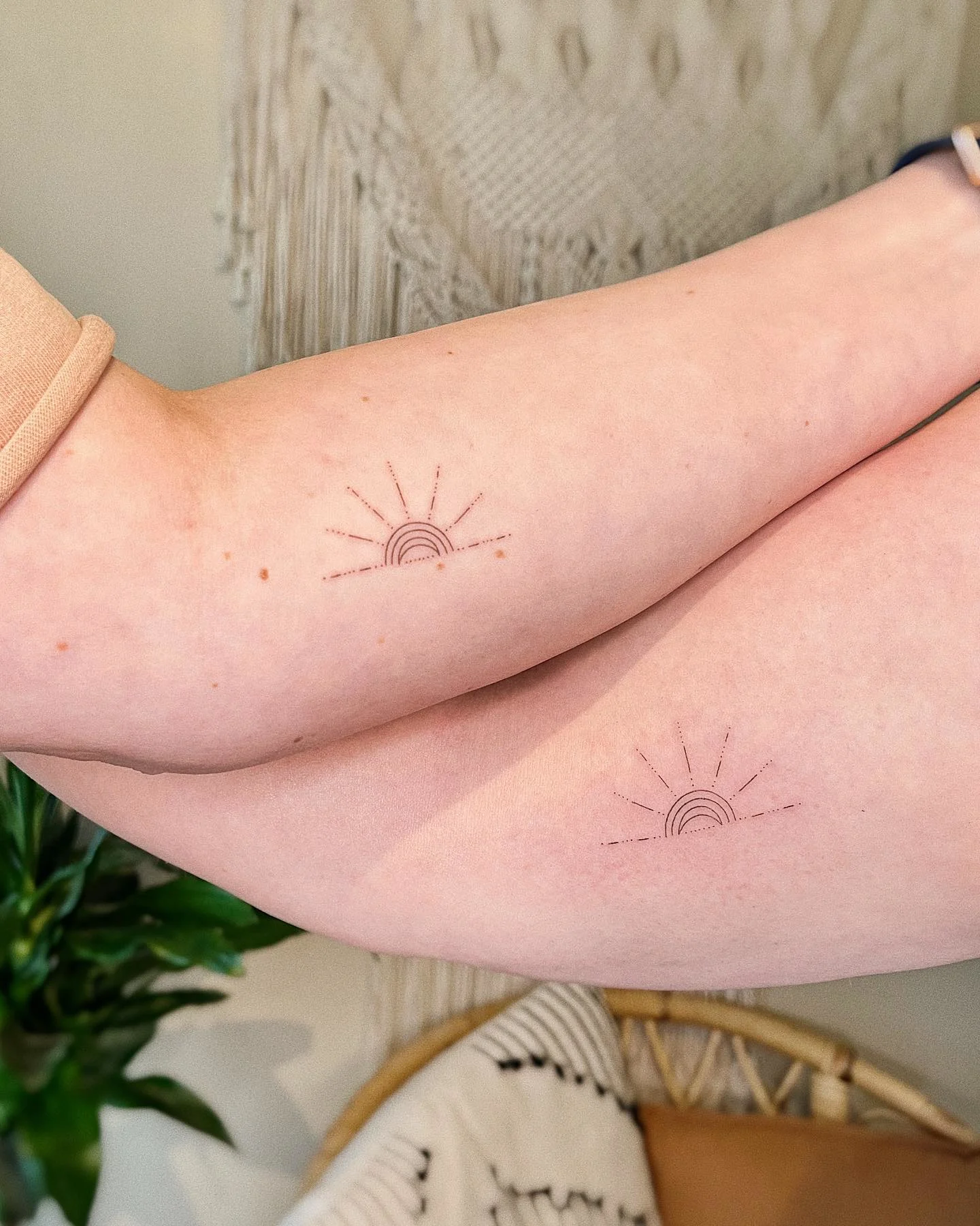 Each tattoo shows a half-sun rising above a simple horizon, its rays extending evenly across the arm.