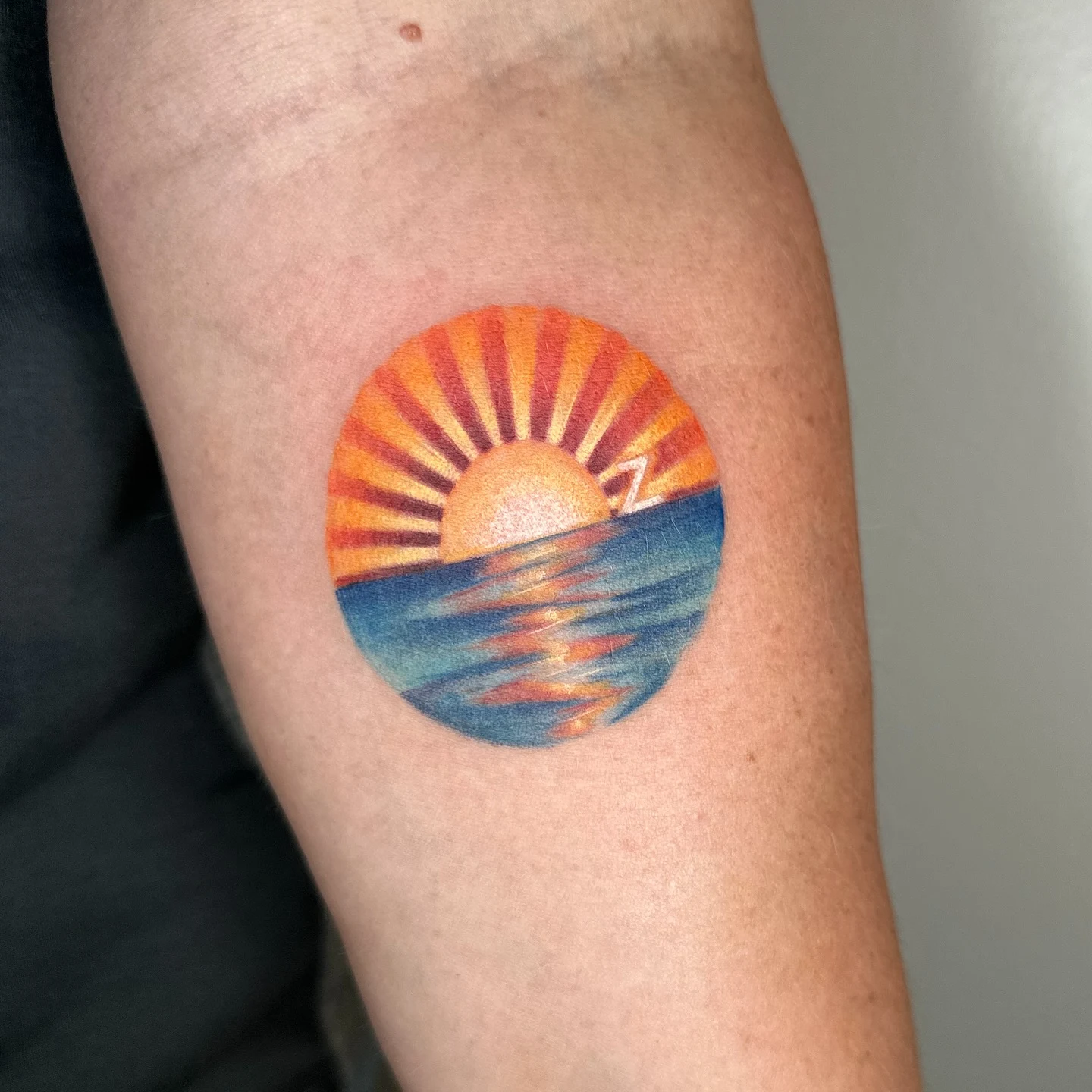 This colorful sunrise tattoo captures the warmth of morning light meeting calm ocean waves.
