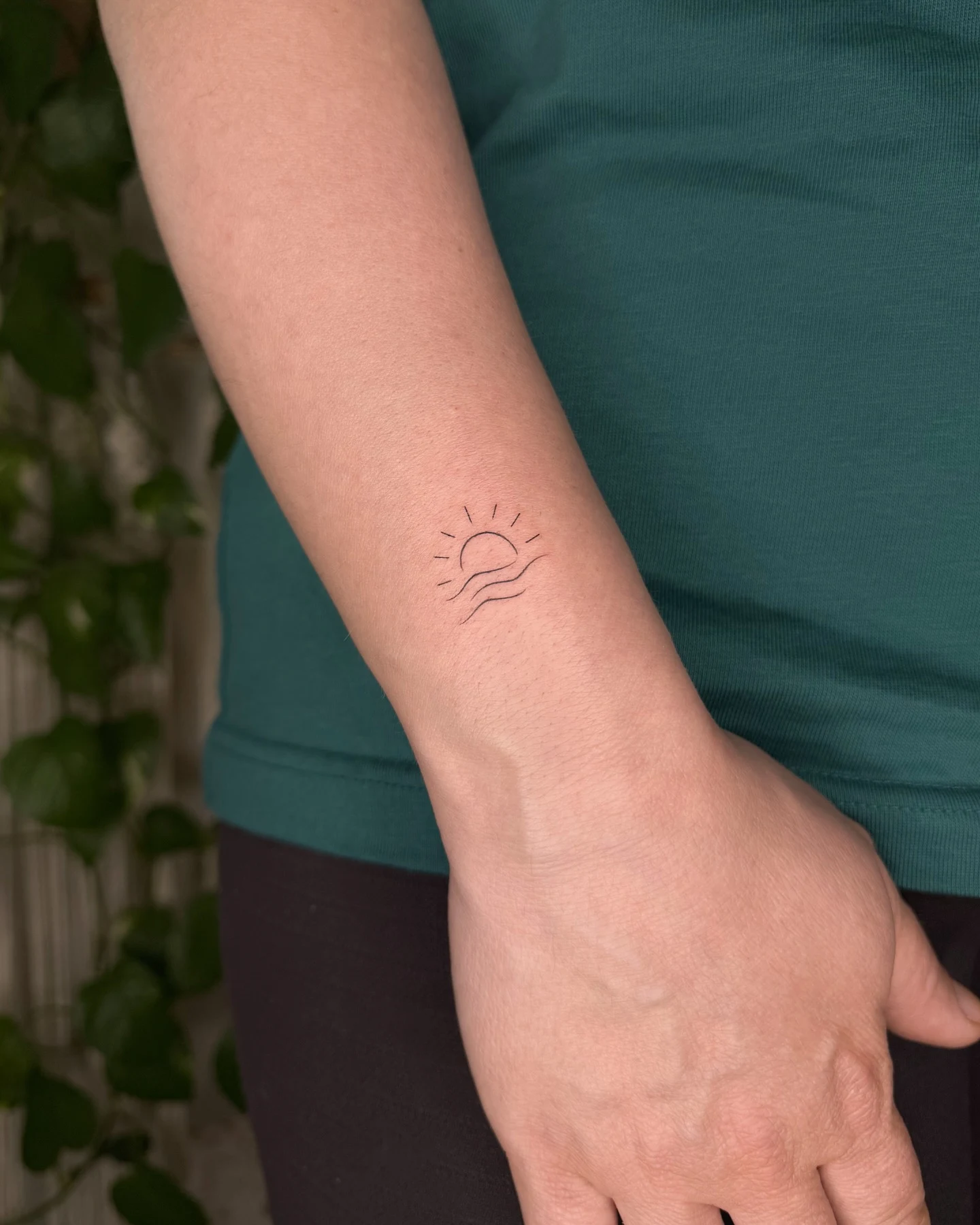 This minimalist tattoo features a rising sun above a wavy line that subtly represents water or a horizon.