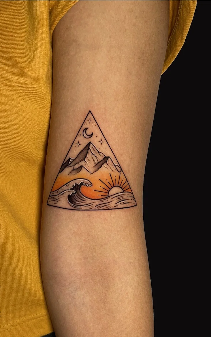 Triangle Sunrise Tattoo with Waves and Mountains