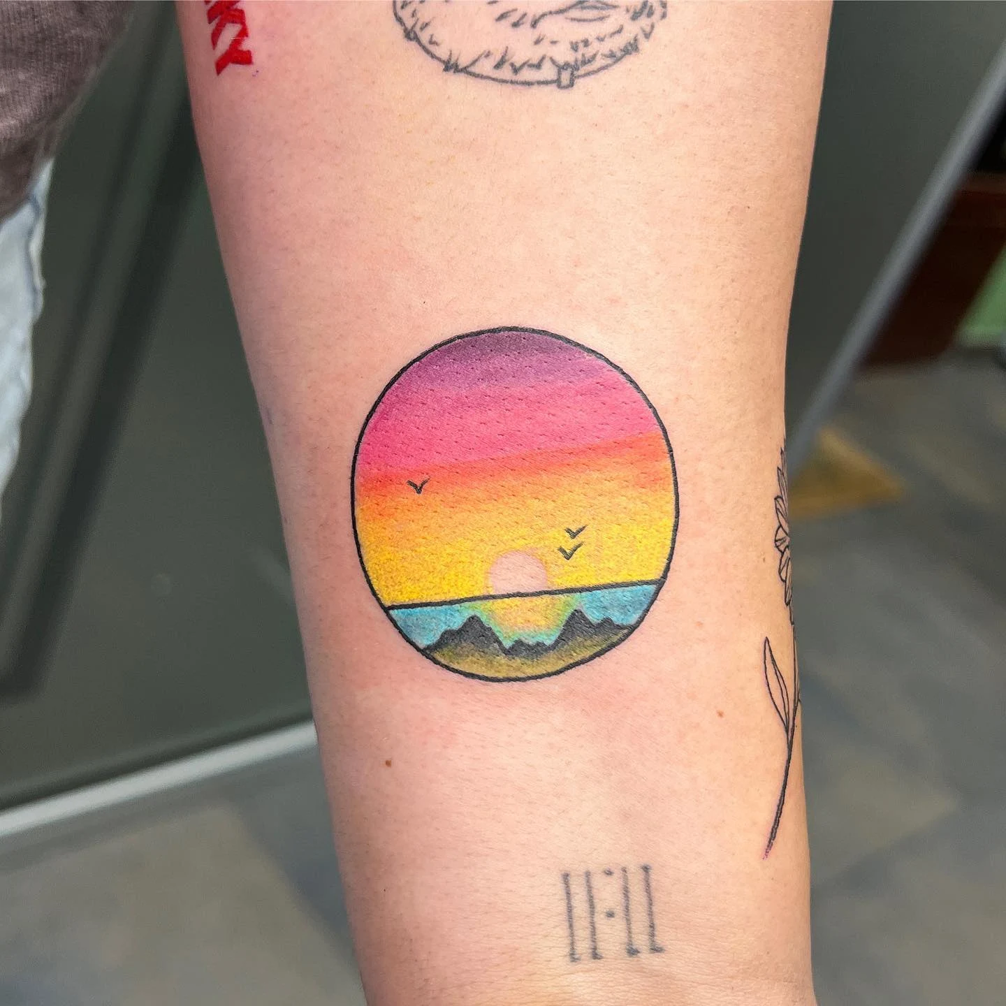 This circular sunrise tattoo blends warm and cool tones beautifully to create a serene, heartfelt design.