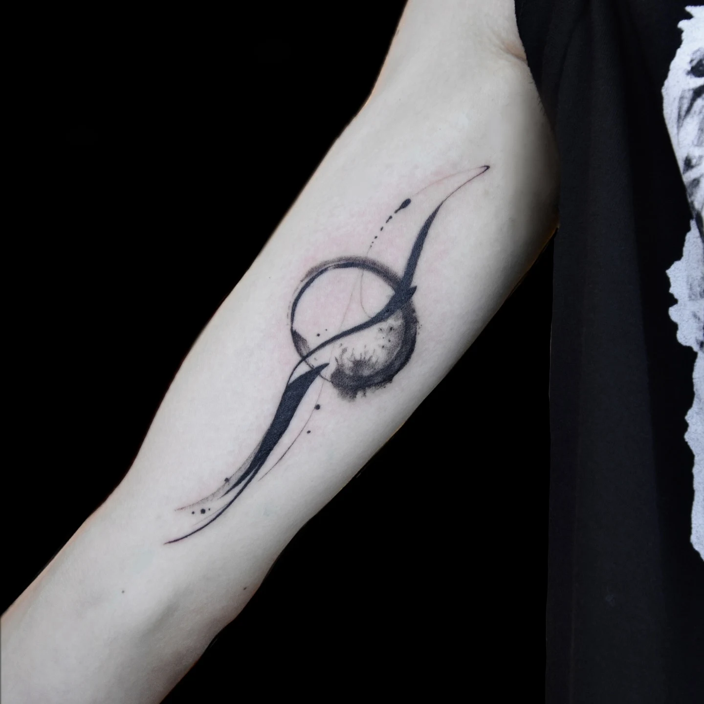 Soft splatters and fine dots add texture, giving the piece an expressive, almost cosmic energy. The blend of solid black and fading gradients makes it feel dynamic yet balanced.