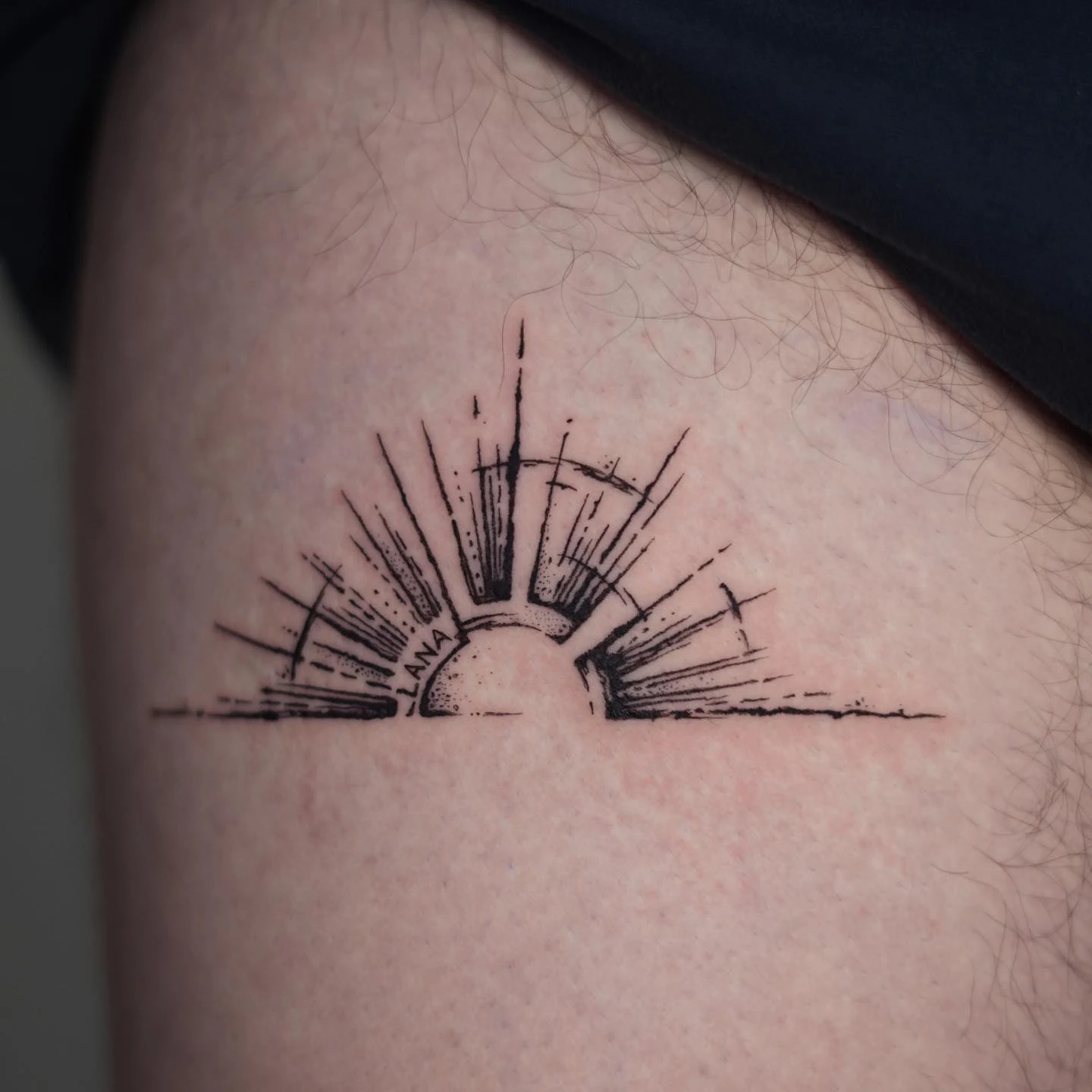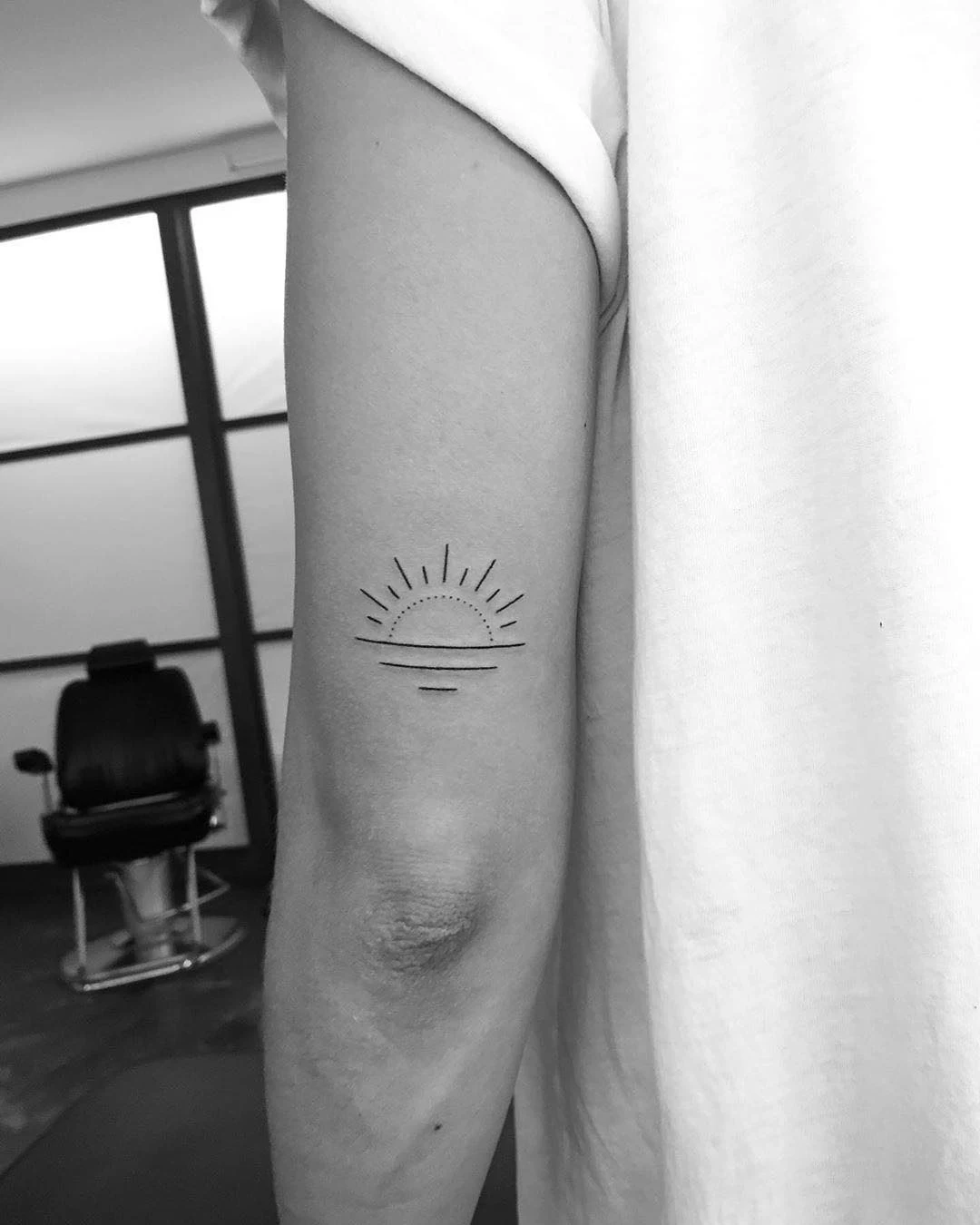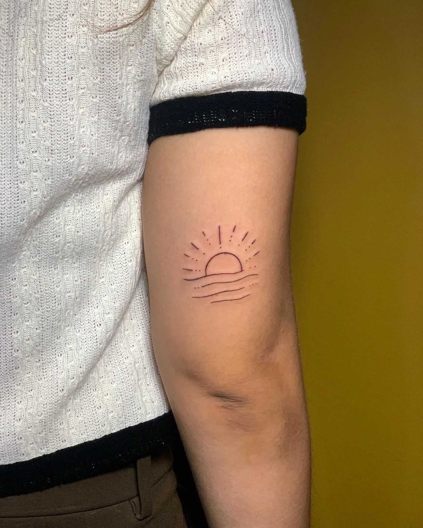 Fine Line Sunrise Tattoo on Upper Arm