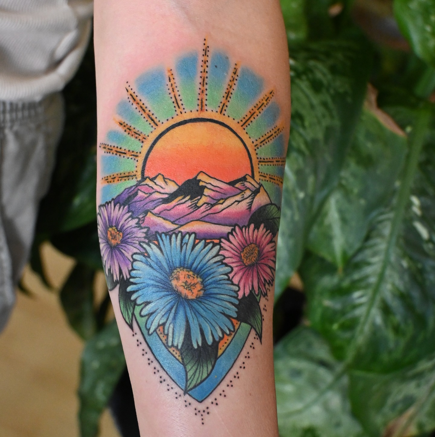 This bright, detailed tattoo brings together a vivid sunrise, mountain peaks, and blooming flowers in perfect harmony.