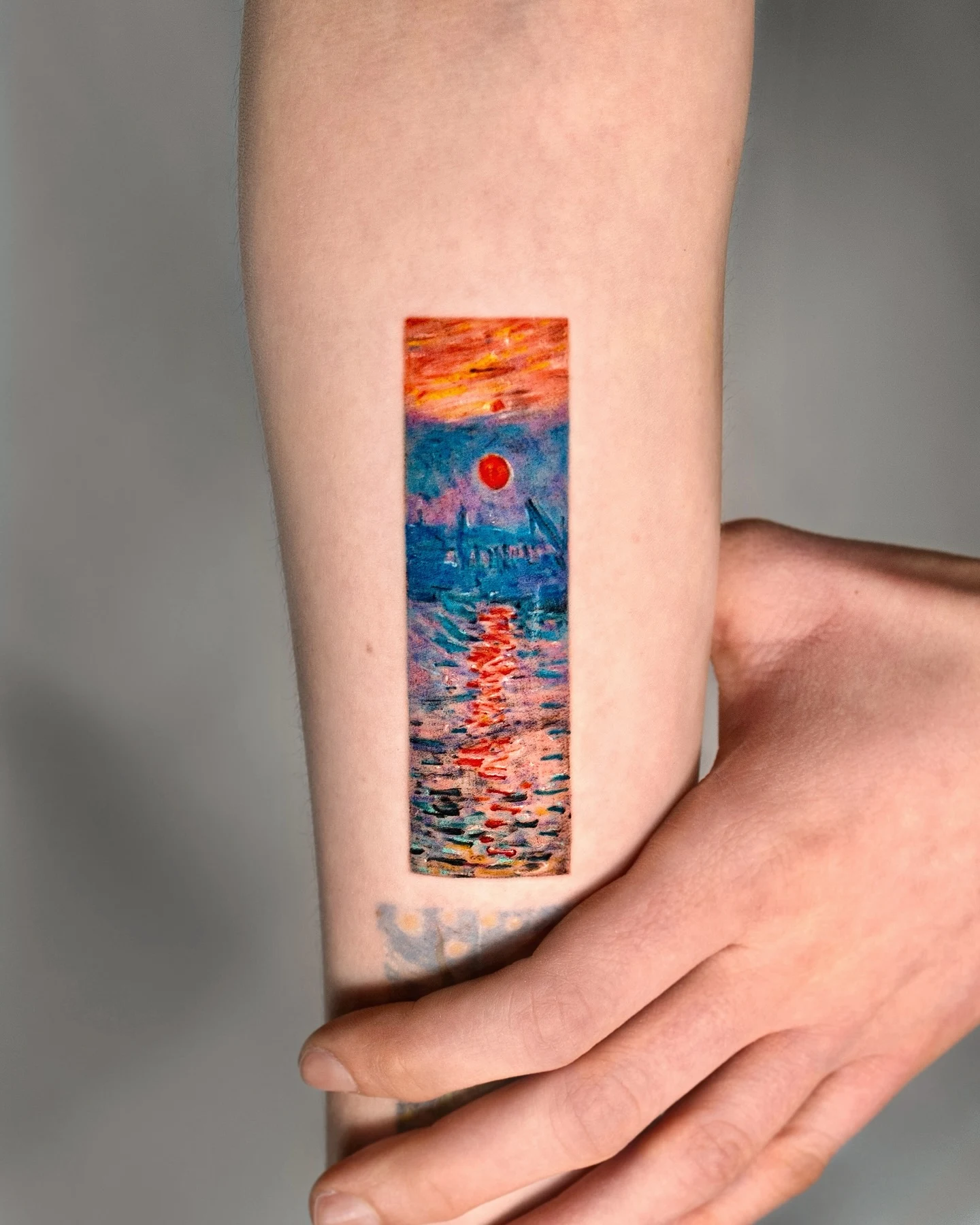 This stunning tattoo recreates Claude Monet’s Impression, Sunrise in a compact, vertical format that feels like a framed masterpiece.