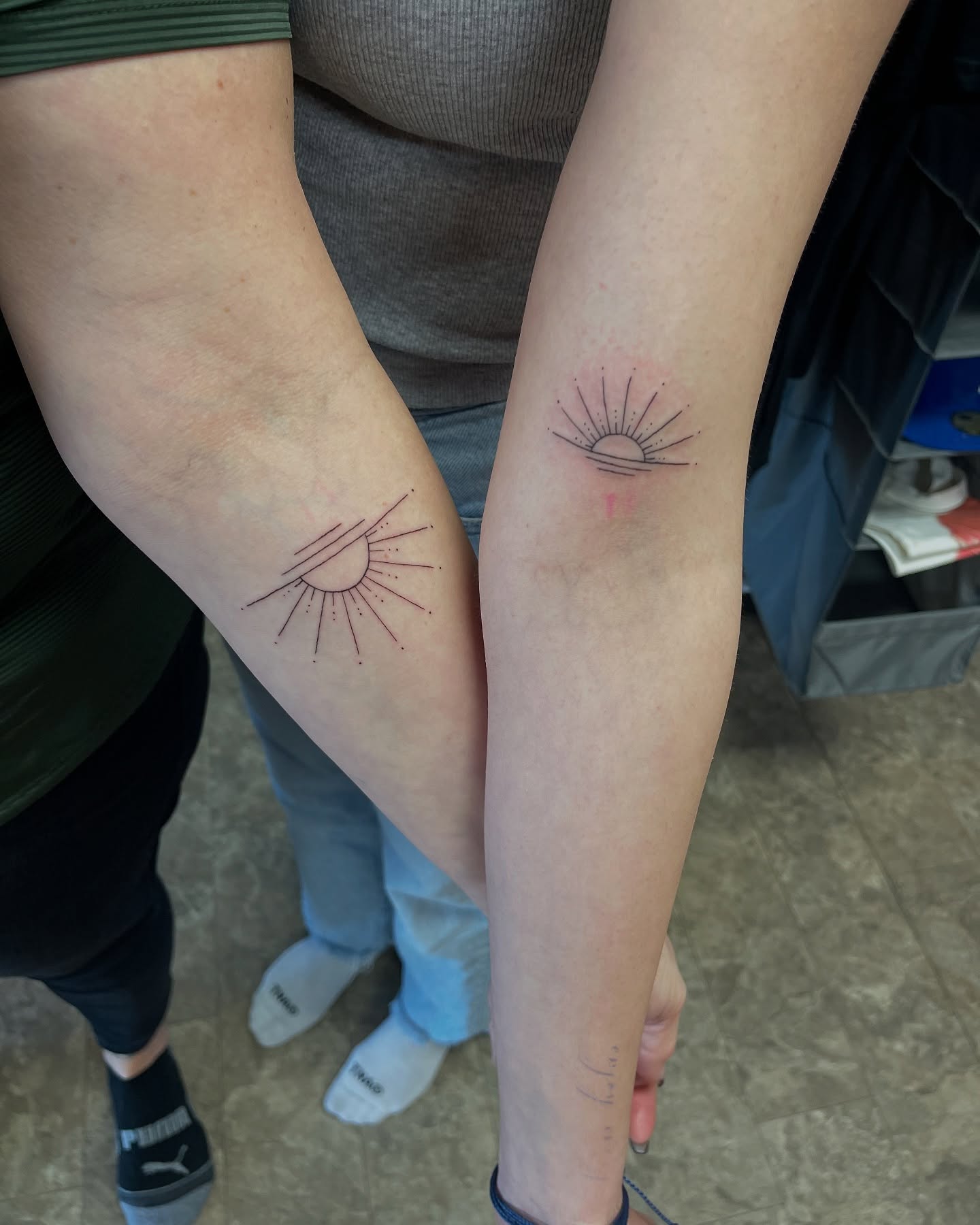 Each tattoo shows a half-sun rising above a simple horizon, its rays extending evenly across the arm.