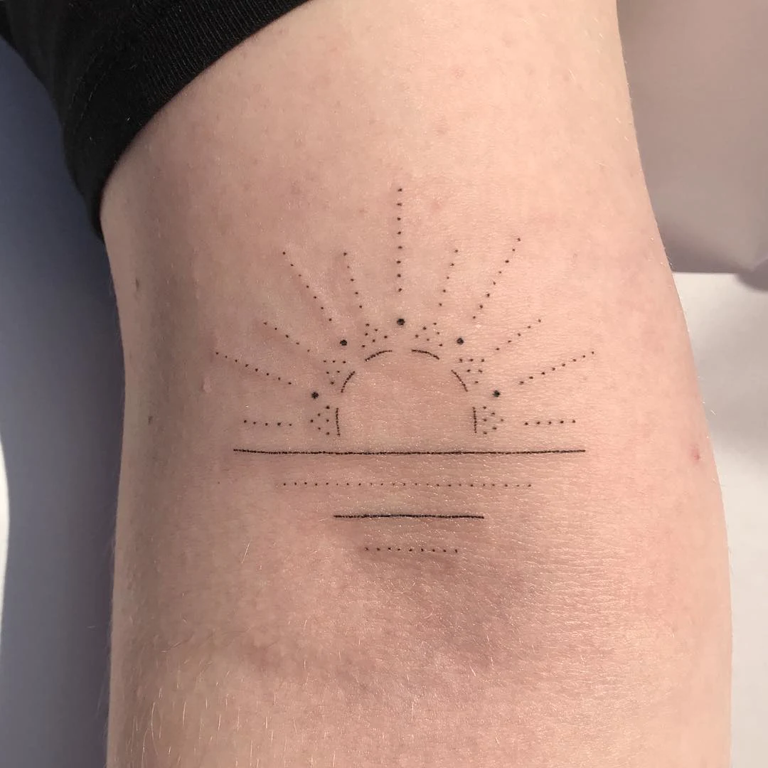 This minimalist sunrise tattoo uses precise dotwork to create a delicate and balanced design.