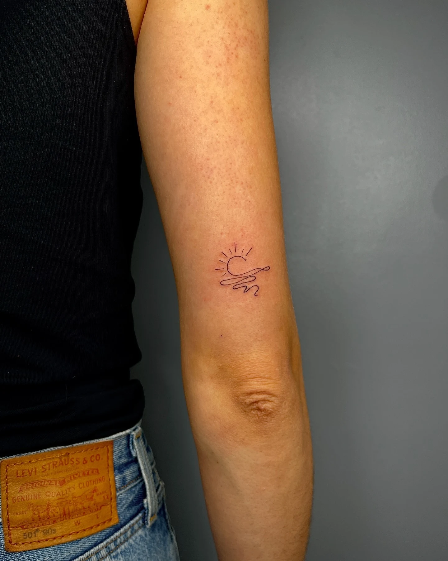 A fine horizontal line wraps around the arm, interrupted by a small sun half above and half below the horizon.