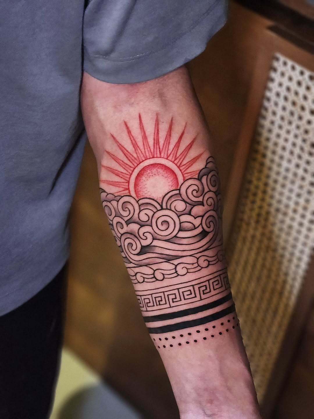 This bold forearm tattoo combines traditional patterns with a modern sunrise design.
